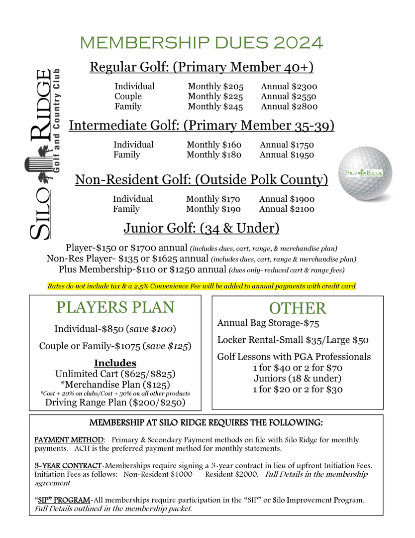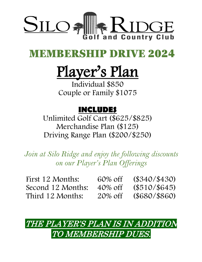 Silo Ridge is a private golf course located in the heart of the Ozarks-Bolivar, Missouri. We offer a variety of golf membership as well as social memberships. The golf memberships have several classifications based on age, number of golfers, and area of residence. For the avid golfer, the Players Plan is available. The Players Plan is an upfront fee (in addition to membership dues) that includes unlimited cart and driving range use, and the Silo Merchandise Plan. Other amenities may be added to memberships as well.