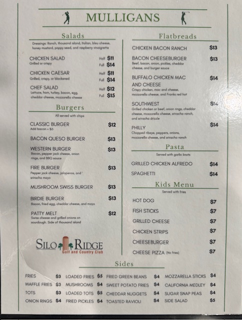 Mulligans also offers a great dinner option to our golfers and the Bolivar community. Diners can enjoy food at the bar, the members only lounge, or the regular dining room overlooking the beautiful golf course. The menu features Steak, Chicken, Fish, Pasta, Salads, and great specials.